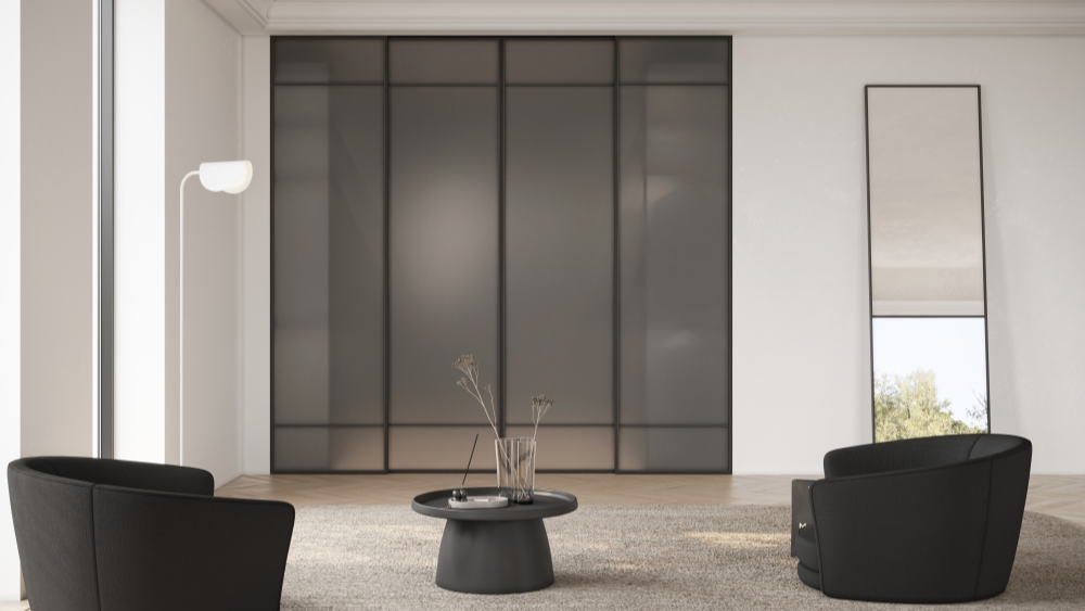 Детали сдвижной системы монтируются в специальный паз, находящийся в верхней перекладине каркаса перегородки.