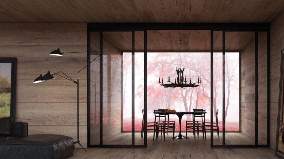 Стеклянная створка с профилем из LVL-бруса
