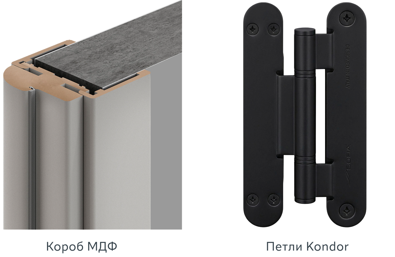 Со скрытыми коробами дверь комплектуется скрытыми итальянскими петлями Colibri.